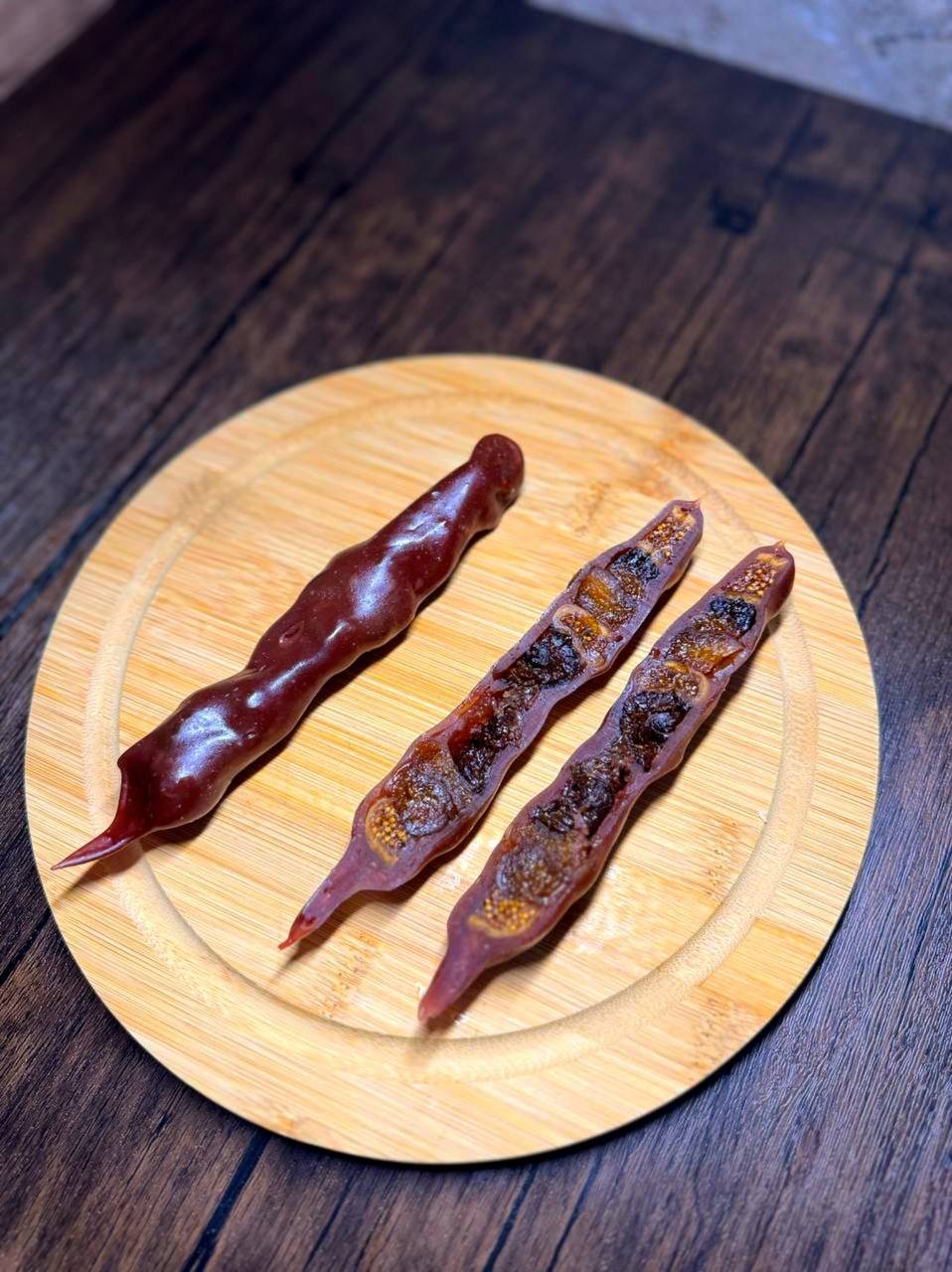 An exotic twist on churchkhela with sweet figs and prunes, coated in grape syrup. A unique fruity delight!