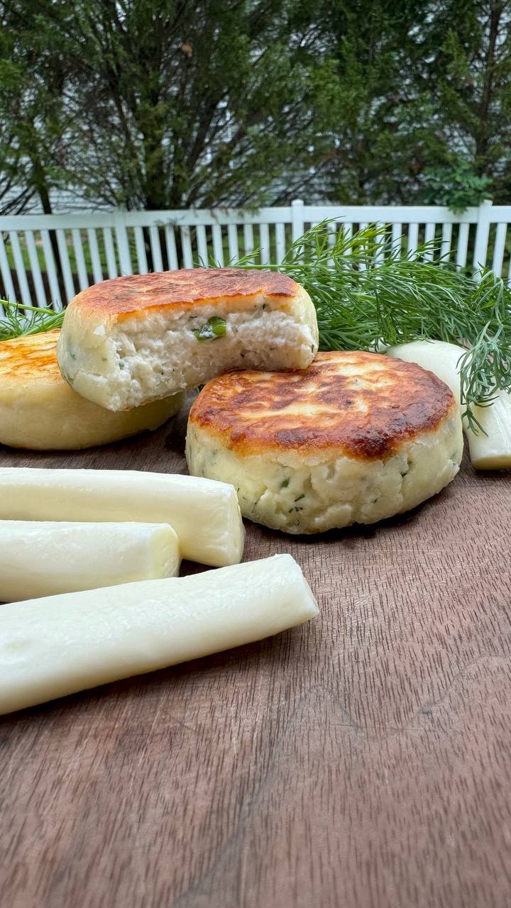 An original interpretation of classic syrniki in Georgian style — an amazing combination of tender cottage cheese and piquant suluguni cheese with aromatic herbs. These savory syrniki represent a vivid example of Georgian cuisine, where traditional ingredients create a completely new taste.
